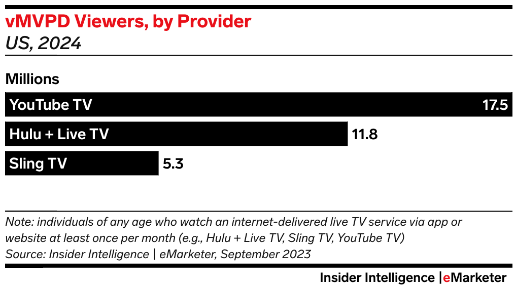 Key stat: 41.2% of virtual multichannel video programming distributor (vMVPD) viewers watch on YouTube TV, making it the most popular service of its kind.
