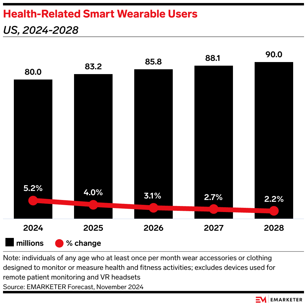 By the numbers: 80 million Americans currently use a health-related smart wearable, a figure that’s projected to rise to 90 million in 2028, according to our forecast.