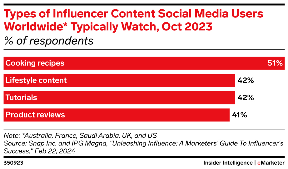 Key stat: Cooking recipes are the most popular form of influencer-created social media content, according to 51% of worldwide social media users, per a February 2024 report from Snap Inc. and IPG Magna.