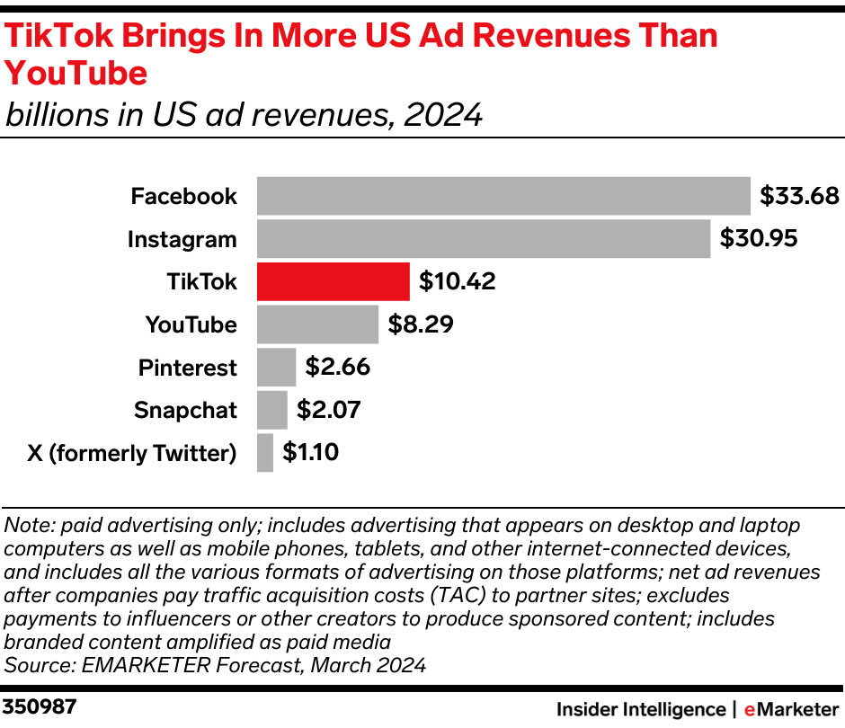 TikTok’s US ad business will be less than one-fifth the size of Meta’s in 2024, but it surpassed YouTube in ad revenues last year, per our forecast. Its ad business is also bigger than those of Snapchat, X (formerly Twitter), and Pinterest combined, demonstrating its position as a must-buy for advertisers. The US is a highly lucrative market for TikTok, accounting for about half of its worldwide ad revenues in 2024.