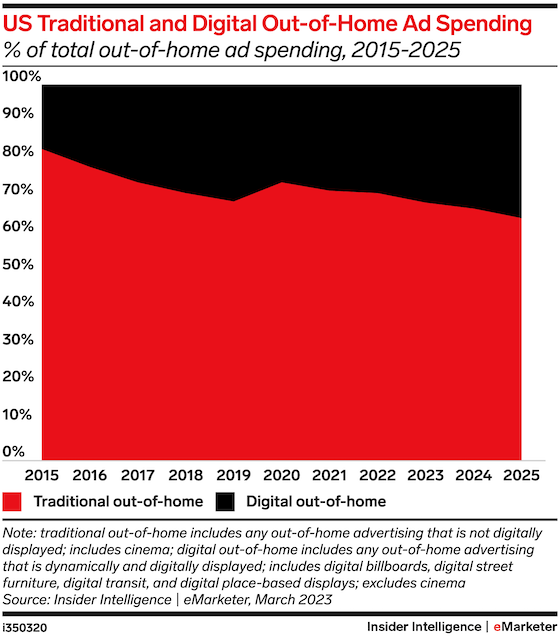 Key stat: US digital out-of-home (DOOH) will make up 31.4% of out-of-home (OOH) ad spend this year, showing recovery after a pandemic dip, according to our forecast.