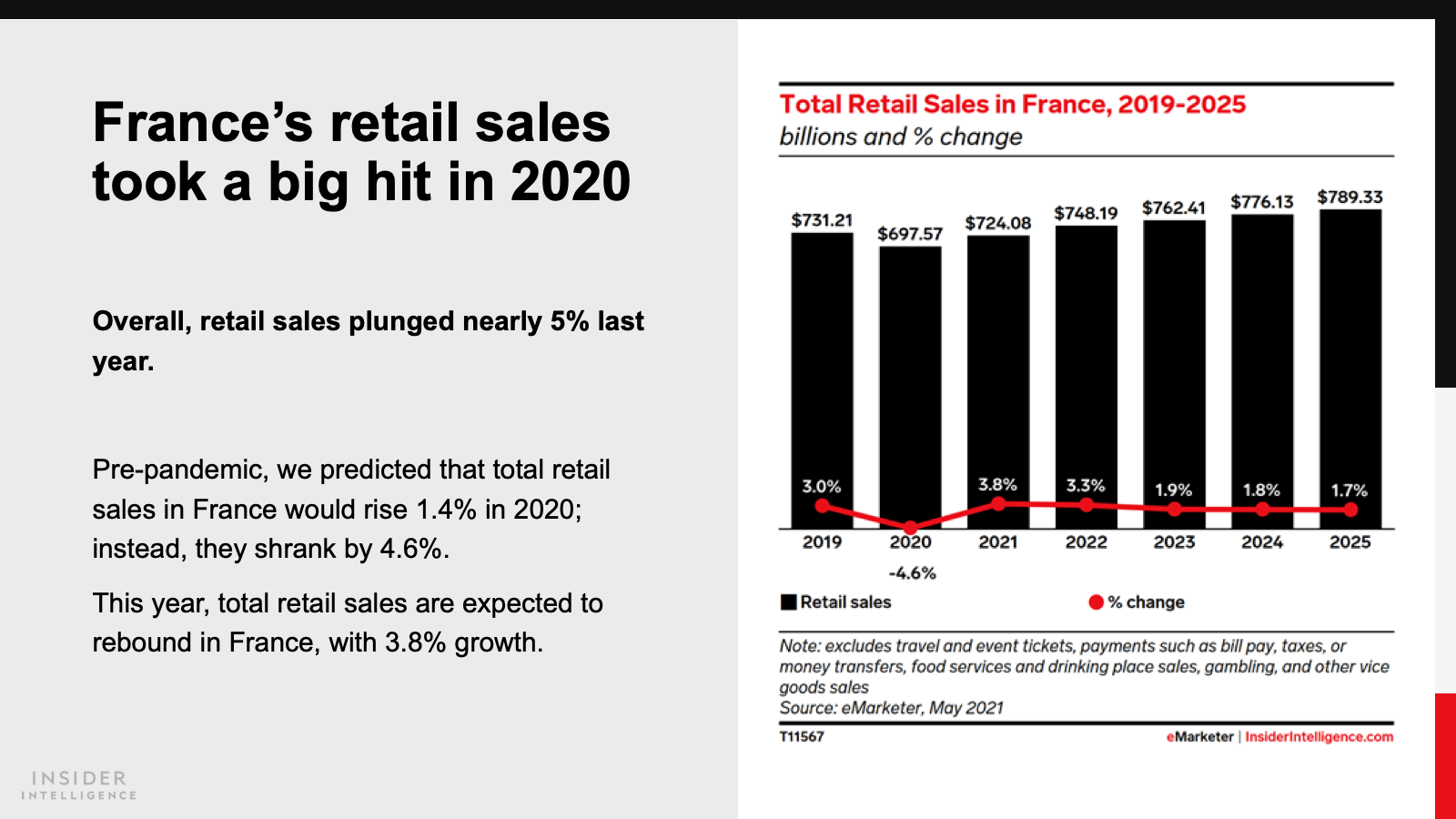 Both countries will pass milestones in 2021, as sales reach $81.03 billion (€71.06 billion) in France and $101.20 billion (€88.75 billion) in Germany. Annual growth rates will decline to single digits this year, as some retail trade returns to physical stores.