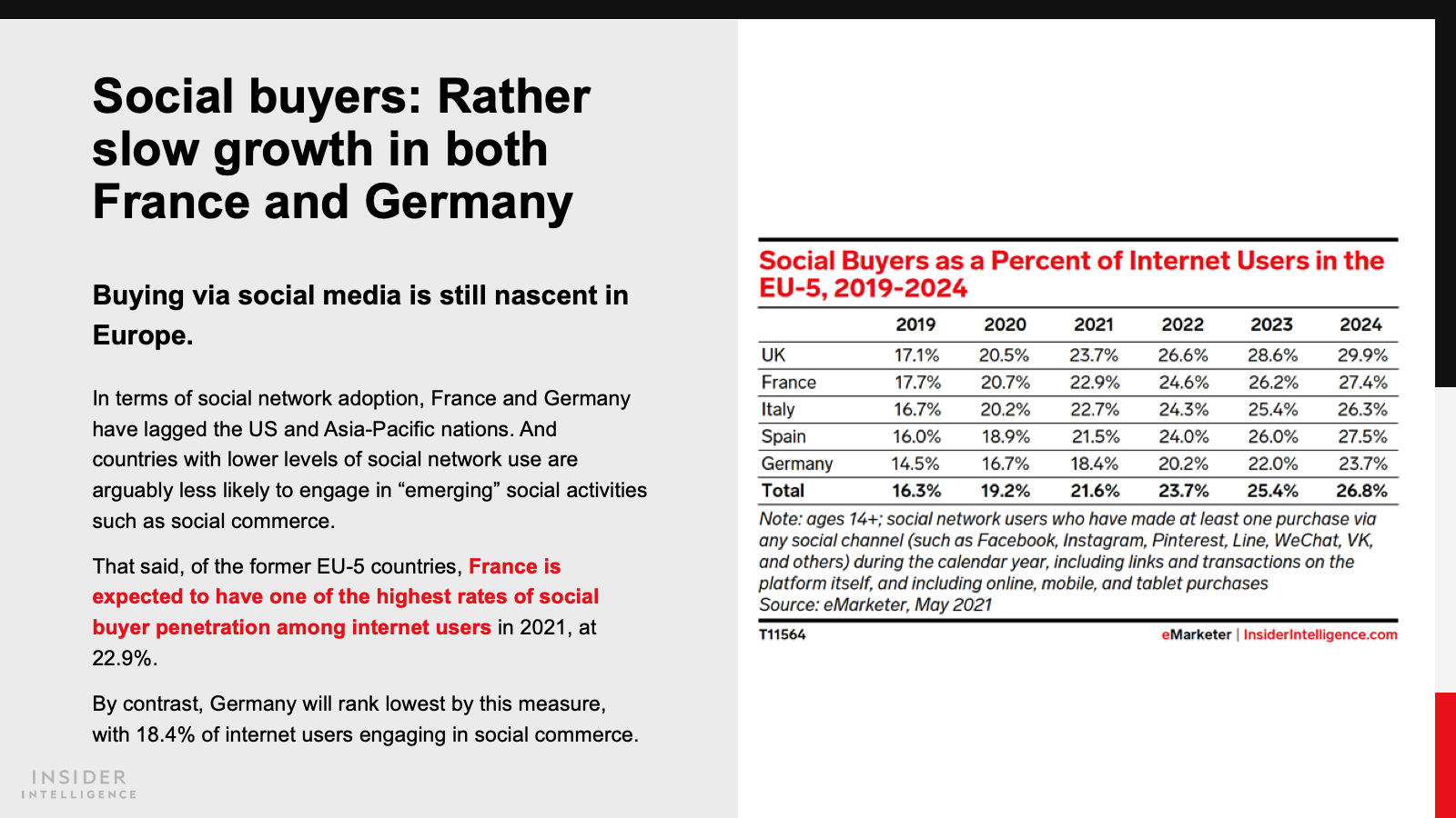 Buying via social platforms isn’t yet widespread in France and Germany. That said, we expect nearly 23% of internet users in France to be social buyers this year. Internet users in Germany are less engaged; fewer than one in five will buy via social networks in 2021.