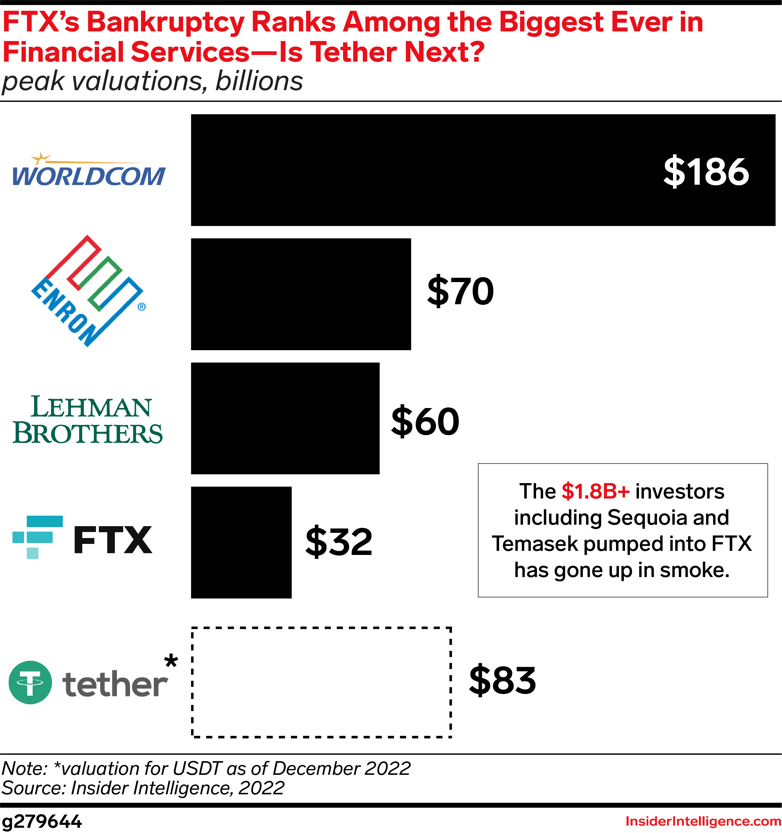 The scale of FTX’s bankruptcy has placed it among the biggest bankruptcies in financial services history, where it sits fourth behind only WorldCom, Enron, and Lehman Brothers. However, there’s a chance of an even bigger disaster if Tether goes down.