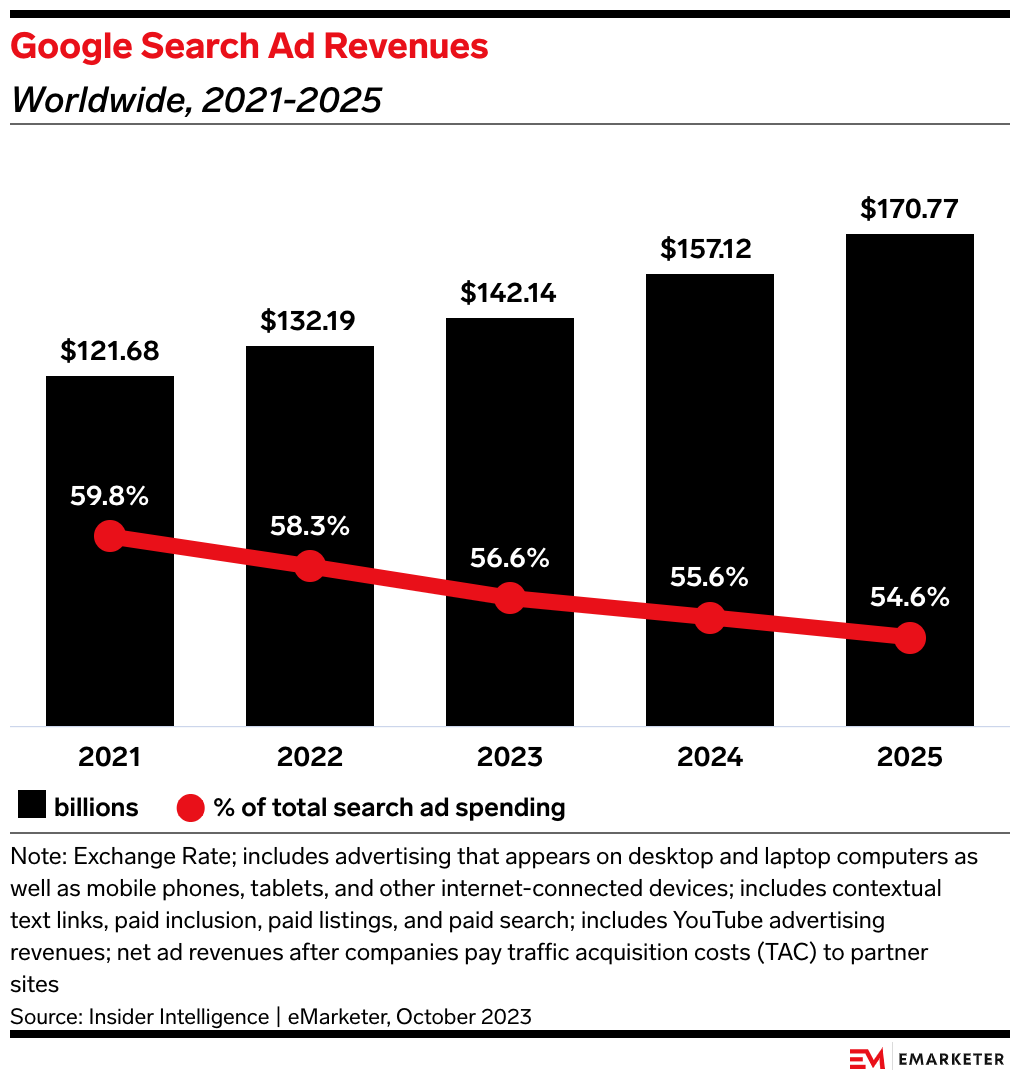 Are cracks showing? Google revenues will make up 55.6% of worldwide search ad spending in 2024 and 27.4% of overall digital advertising spending, per our forecasts.