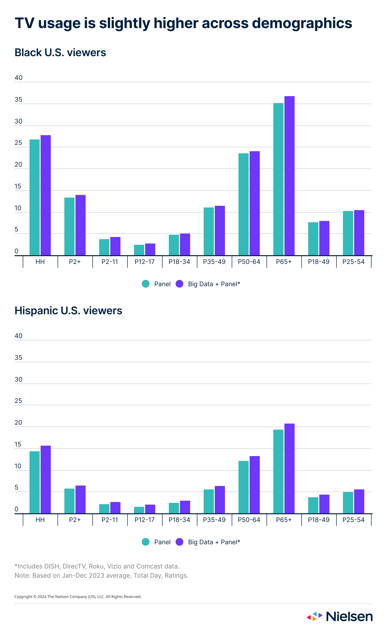When we break TV usage out by race and ethnicity, we see similar trends. The number of Hispanic and Black households using TV also generally increased across each age group with Big Data + Panel.