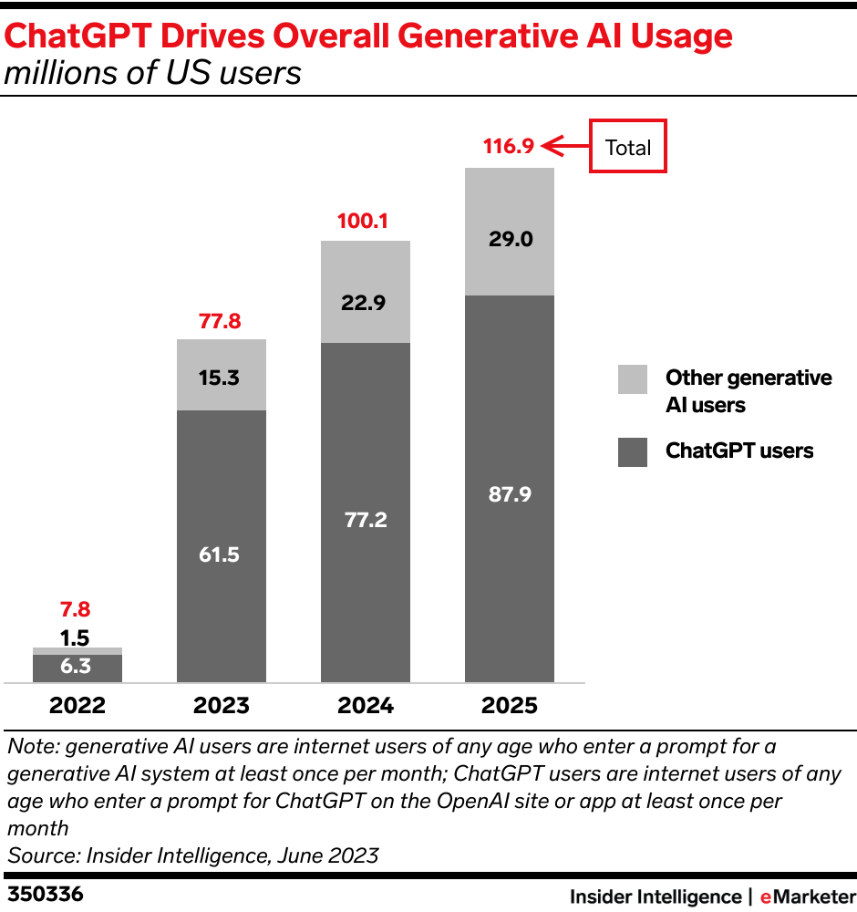 ChatGPT’s early lead will be challenged. Microsoft’s Bing, which uses OpenAI tech, and Google’s Bard launched soon after ChatGPT, but neither has yet offered a meaningful challenge. However, other programs—including Anthropic’s Claude, Baidu’s Ernie, Google’s next-generation chatbot based on its Gemini model, and many others—could threaten ChatGPT’s lead. We’ll know more by the end of H2.