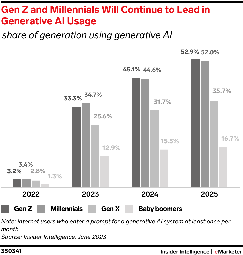 What does this mean for marketers? Unlike other technologies, genAI interfaces use existing language skills—a factor leading to broadscale adoption. Although Gen Zers and millennials will clearly be the most eager to embrace chatbots and other genAI tools, older consumers may get on board as well.