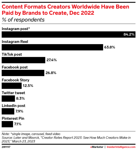 KEY STAT: Instagram remains the top platform for sponsored content, per a March 2023 report from Later and Mavrck, and more creators worldwide report being paid to create Reels compared with TikTok videos.