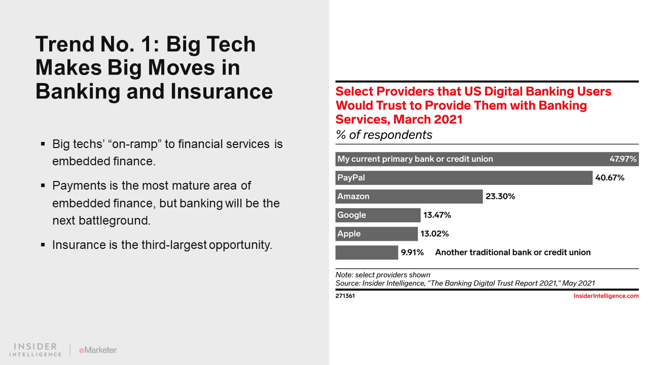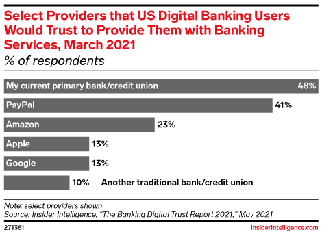 KEY STAT: More than 40% of US digital banking users would trust PayPal to provide them with banking services, signaling that as Big Tech pushes into banking, it will become a viable competitor for banks.