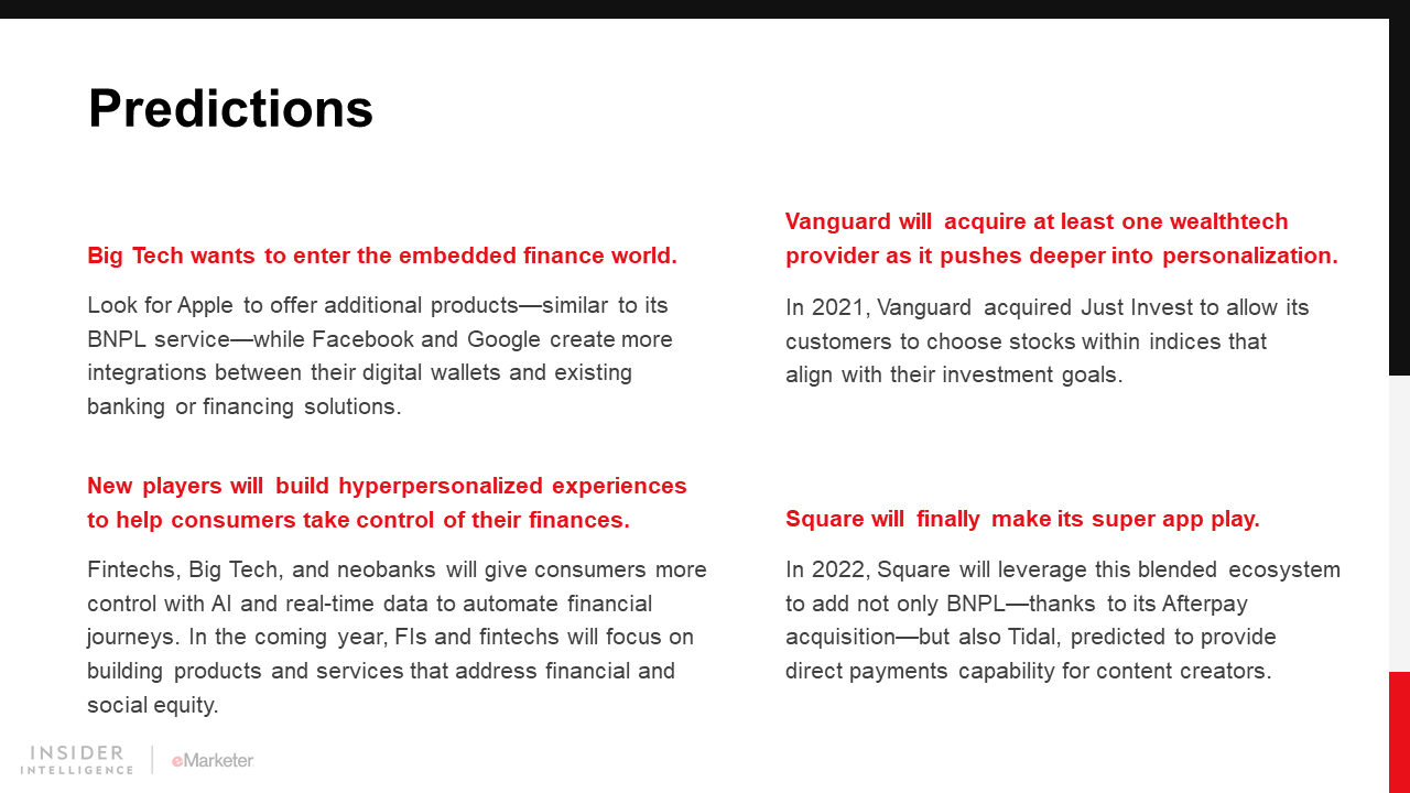 As banking companies focus on meeting heightened consumer expectations for personalized experiences, 2022 may be another record-breaking year. These players will need to weigh partnerships with encroaching Big Tech competitors.