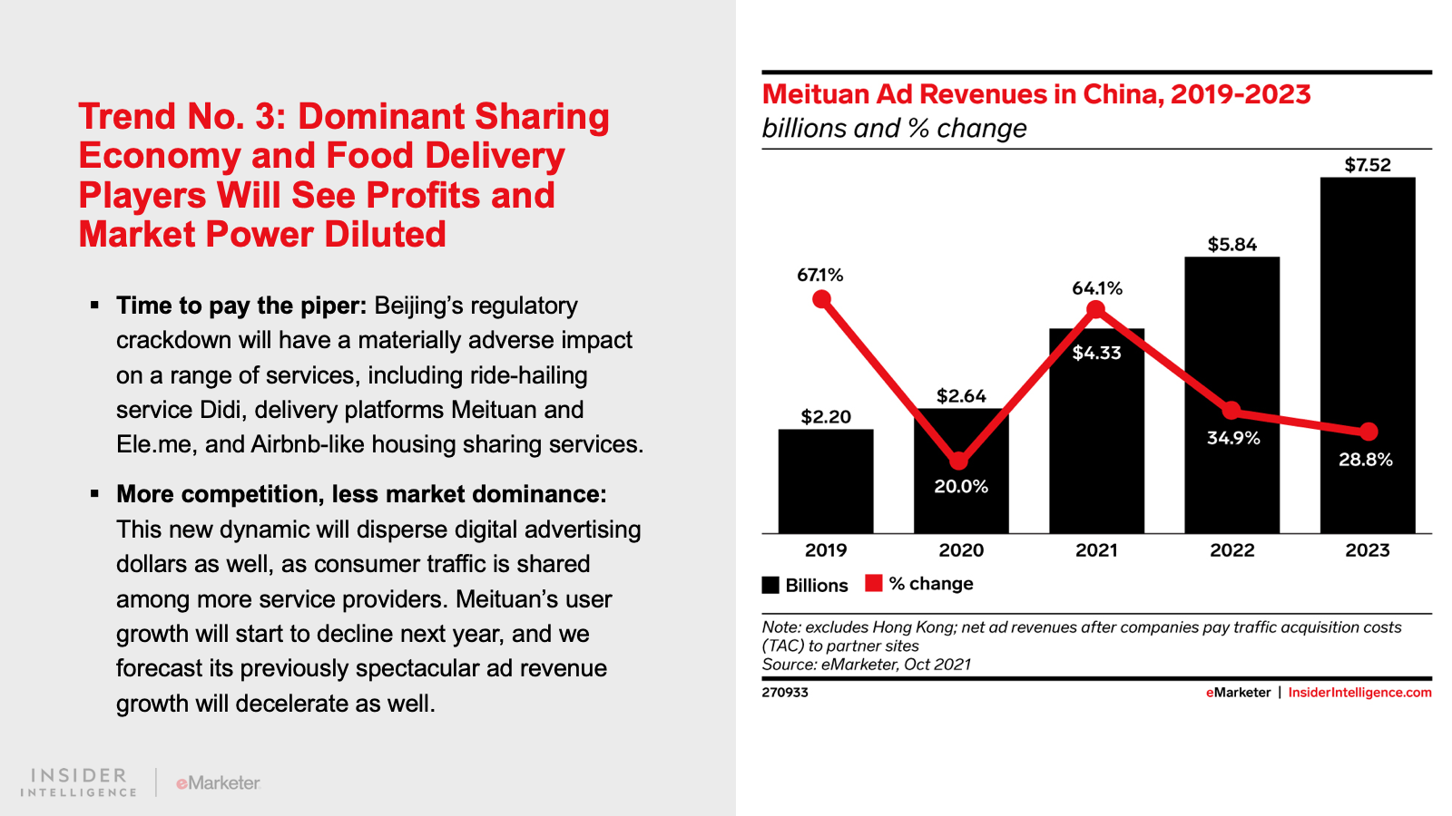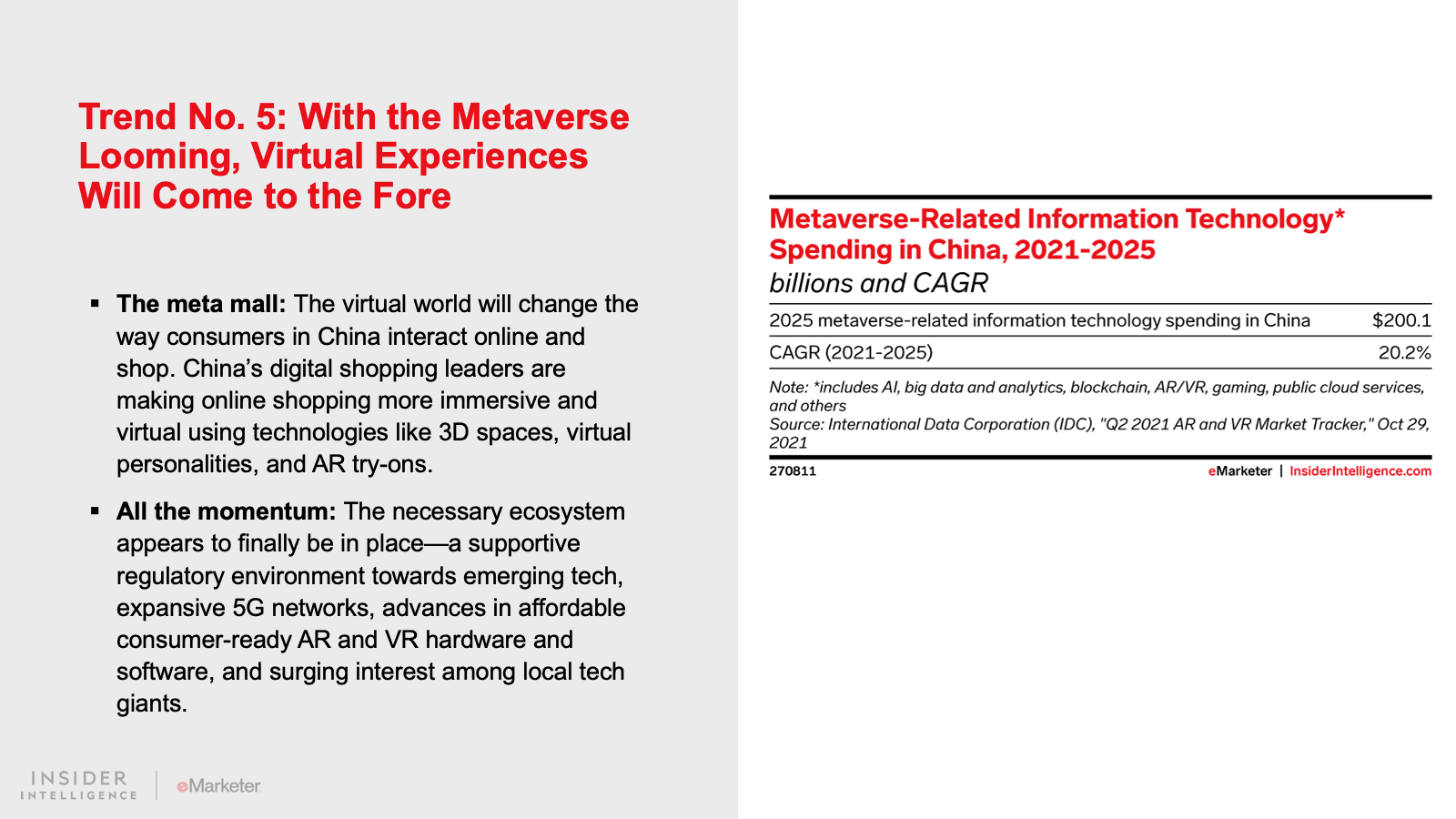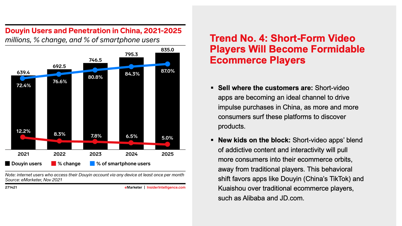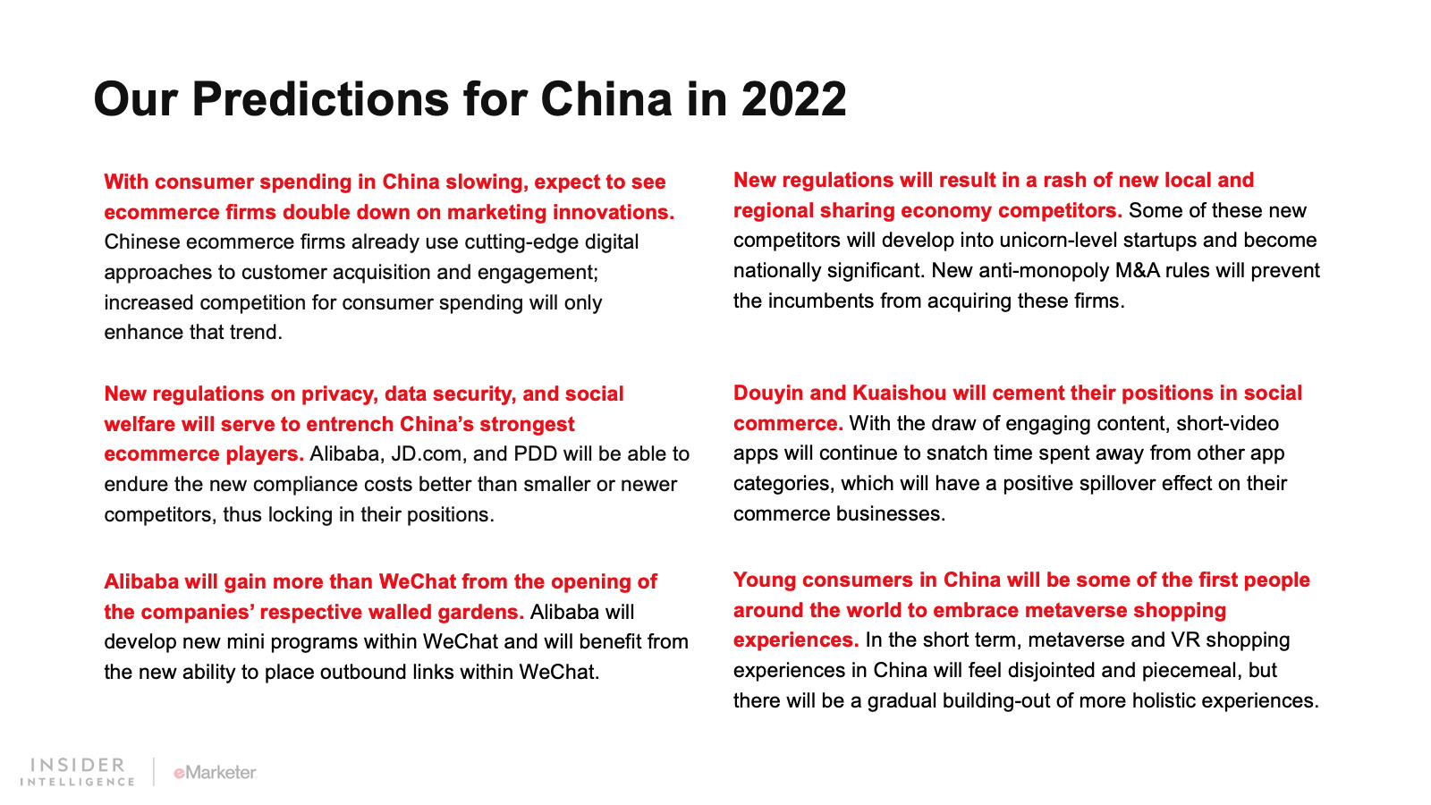 KEY STAT: Ecommerce growth in China will decline to 13.0% in 2022. After a decade of unbelievable expansion in digital shopping, China’s sales increases are expected to settle into globally normal levels going forward.
