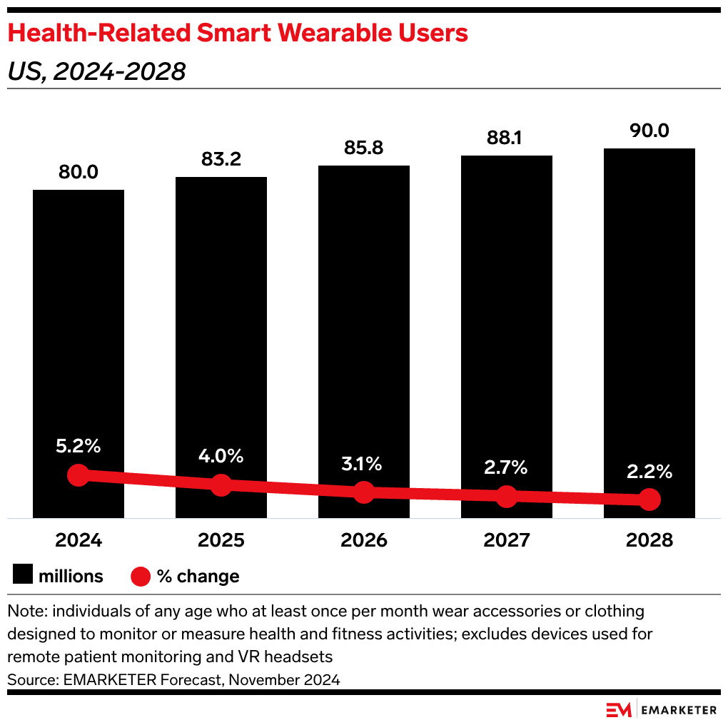 Oura recently updated its fourth-generation smart ring to include women-centric features such as menstrual tracking and pregnancy insights. The company is valued at $5.2 billion and is well-positioned for further success—some 90 million Americans are projected to use health-related smart wearables by 2028, up from the 83.2 million using them today, per our forecast.