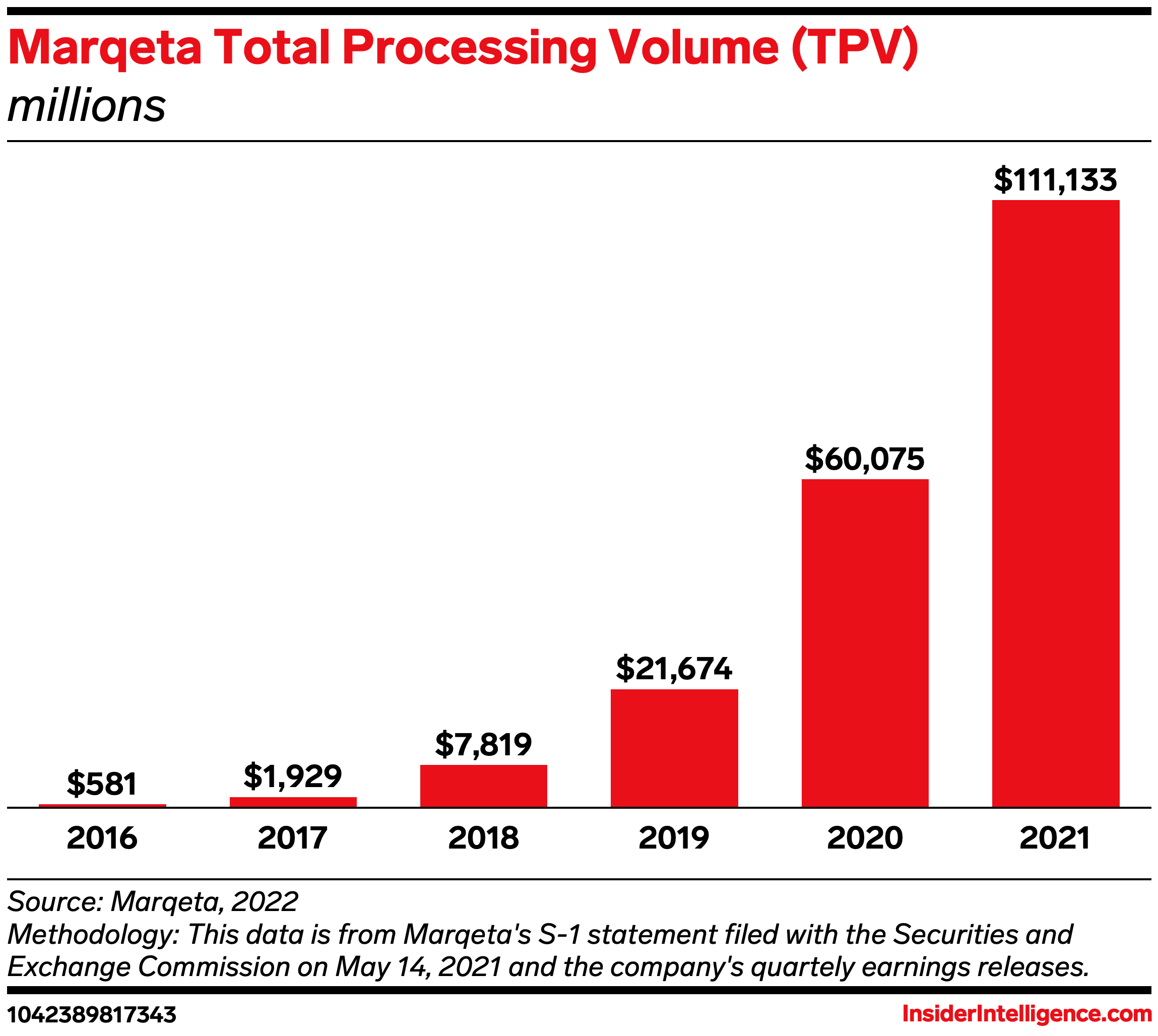 By the numbers: API-based issuer-processor Marqeta reported a 53% year-over-year (YoY) increase in total processing volume (TPV) in Q2, per its earnings release. TPV growth mirrored Q1 but slowed from Q2 2021, when pandemic-related factors catapulted TPV up 76% YoY.