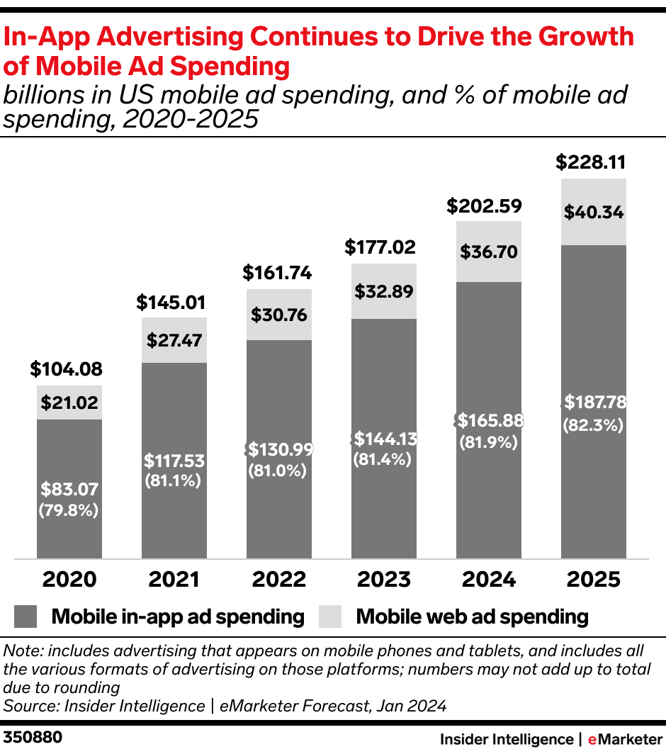 Key Stat: Apps will reach a dominant 81.9% share of mobile ad spending this year, but mobile web advertising also continues to add more dollars each year.