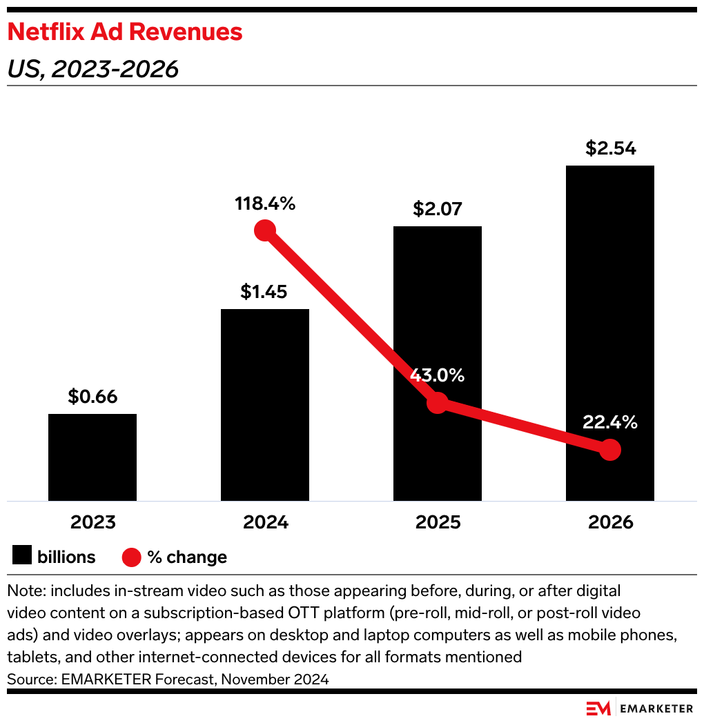 Our take: The US launch of Netflix’s ad tech represents the streaming service’s ad business reaching maturity. Several years of experience under its belt with a noteworthy tech partner will help set the company up for ad dominance, and a strong consumer appetite for ad-supported subscriptions continues to increase its viewer count.