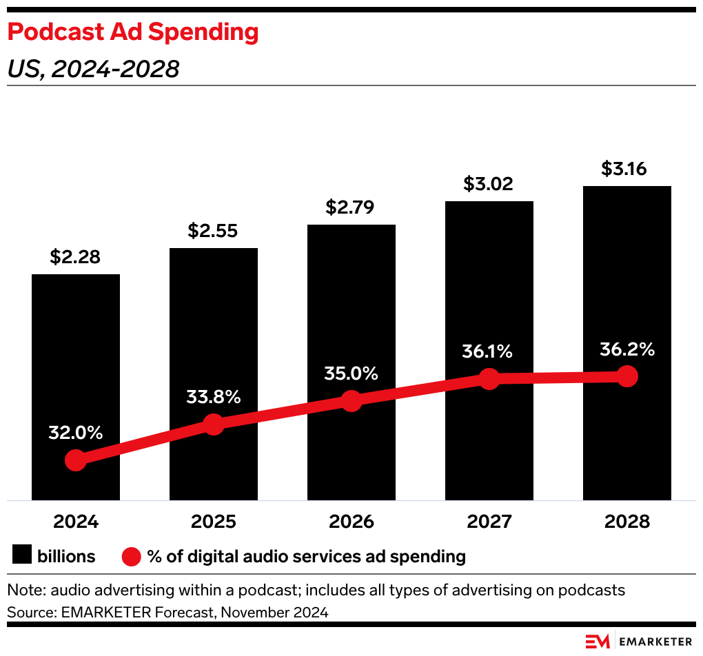 Our take: With US podcast ad spending expected to reach $2.55 billion in 2025, it’s important for marketers to understand where their resources are best allocated to ensure positive results. YouTube’s podcast advantage shows that advertisers who don’t recognize podcasting as a visual medium risk falling behind competitors.
