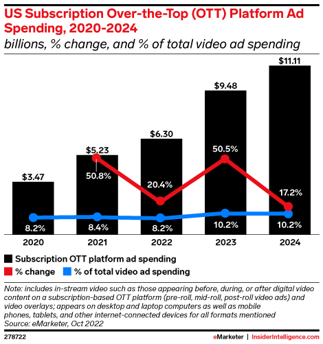 KEY STAT: Ad spending on US sub OTT video services will increase 50.5% in 2023 to $9.48 billion.