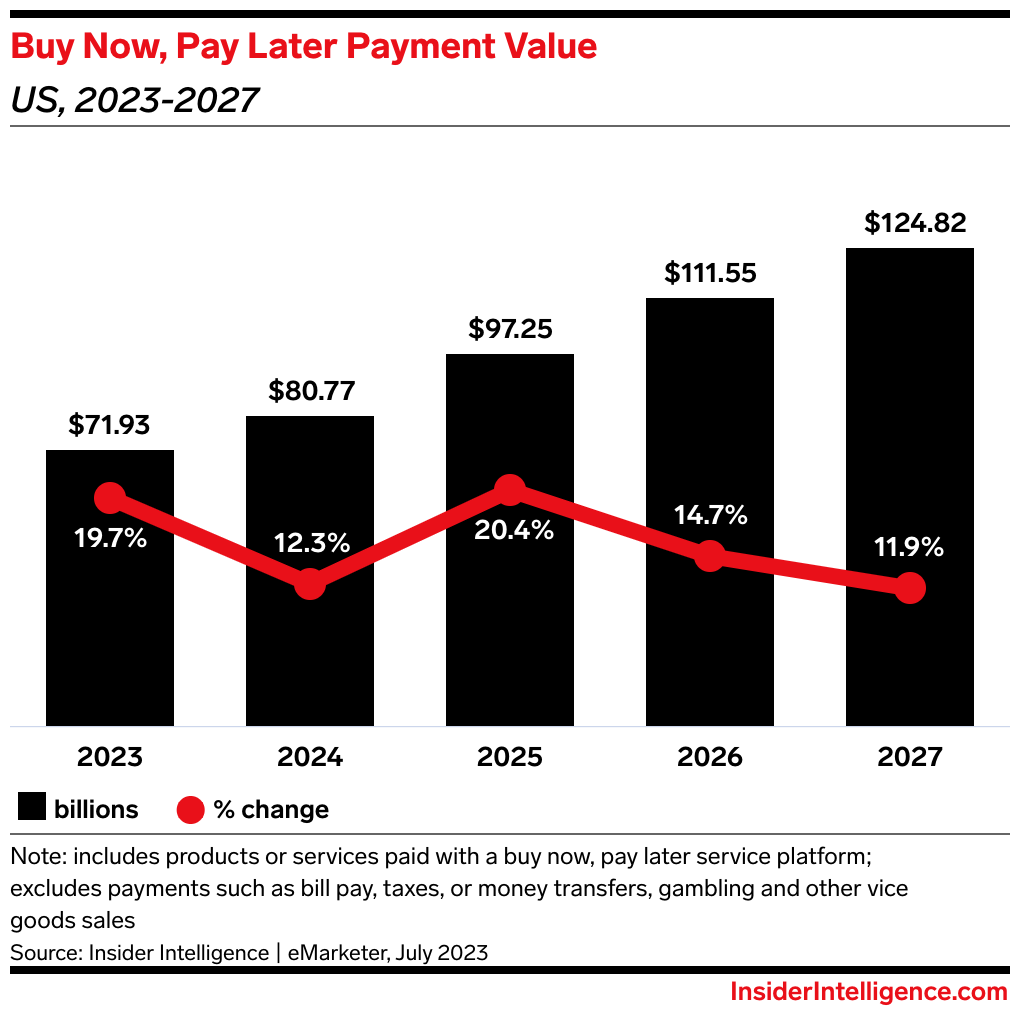 • We expect 82.1 million US consumers will use BNPL in 2023, growing 31.6% YoY. And overall US BNPL payment value will reach $71.93 billion, increasing 19.7% YoY, per our forecast.