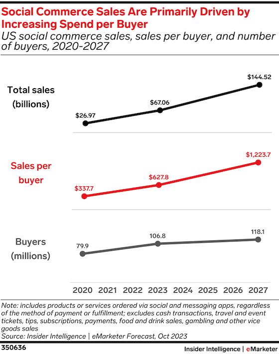 Key stat: US annual social commerce sales per buyer will nearly double from $627.8 in 2023 to $1,223.7 in 2027, according to our forecast.