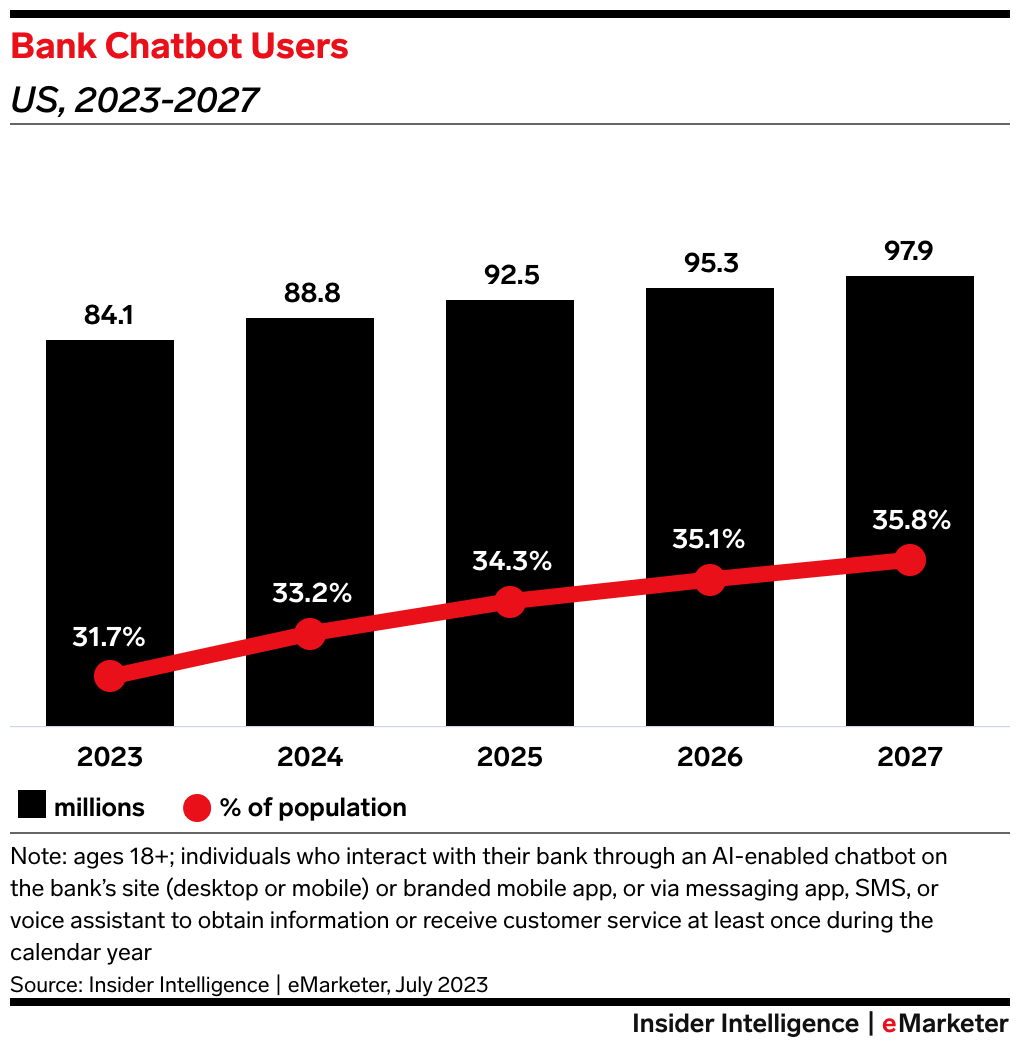 The trend: Forty-eight percent of surveyed US bank executives plan to use genAI to enhance customer-facing chatbots and virtual assistants, per an October 2023 Google Cloud survey. And by the end of 2026, 35.1% of adult consumers in the country will use AI-enabled banking chatbots, per an EMARKETER forecast.