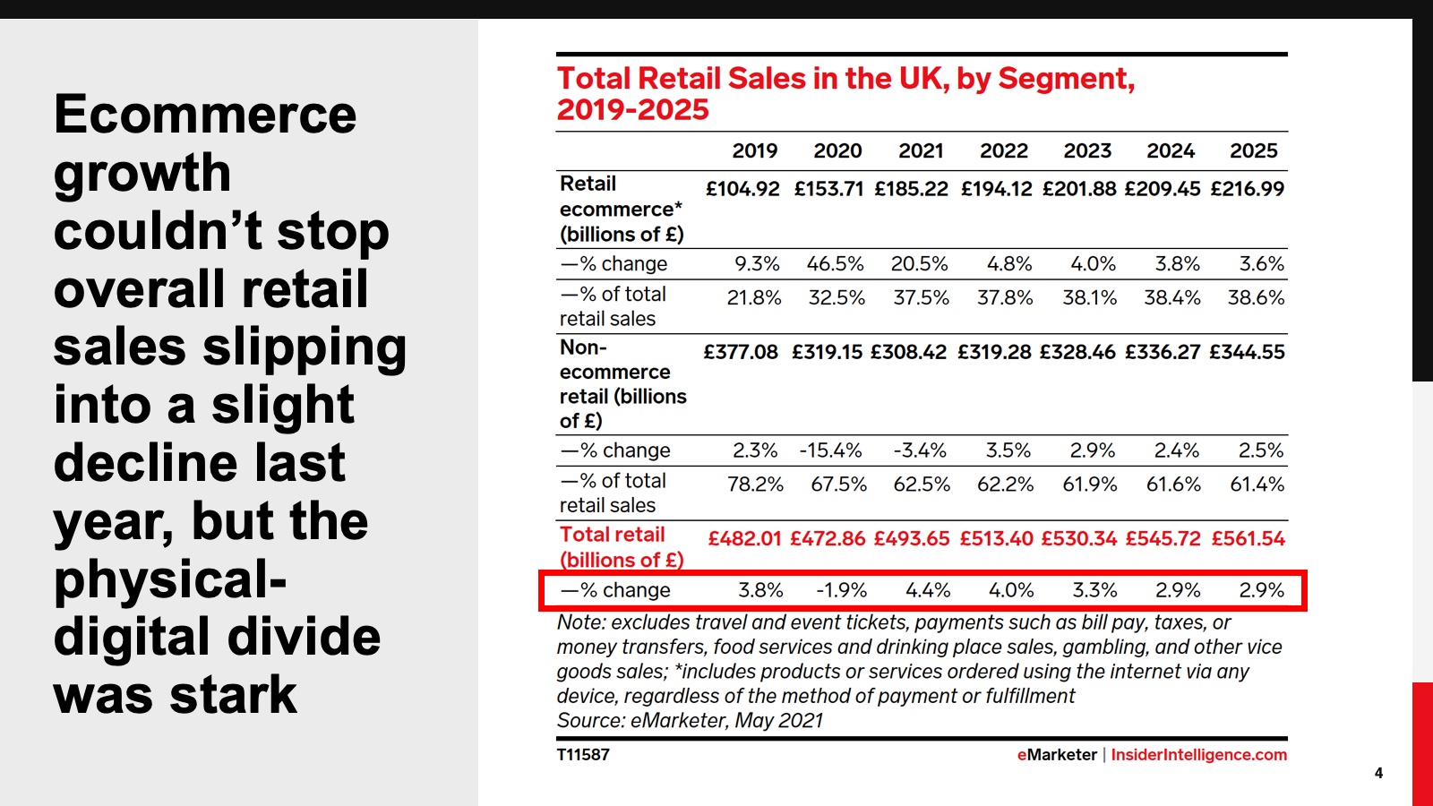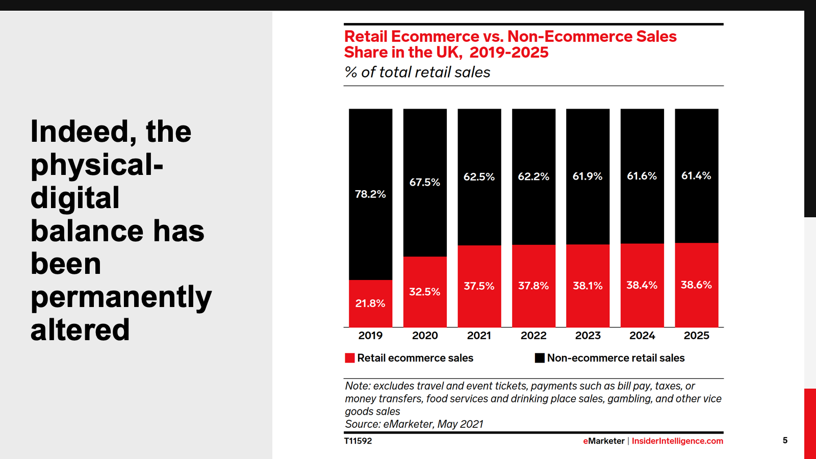 KEY STAT: Physical retail has historically dominated the total retail sales share in the UK, but the pandemic has brought the ecommerce portion much closer to parity. By 2025, ecommerce will account for 38.6% of total retail sales.