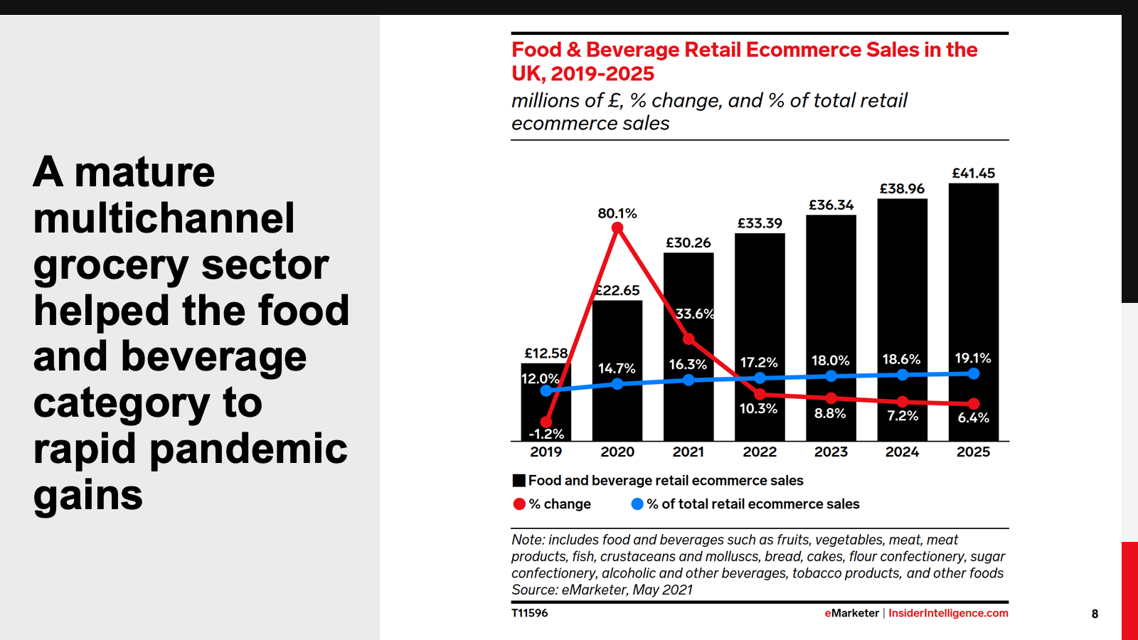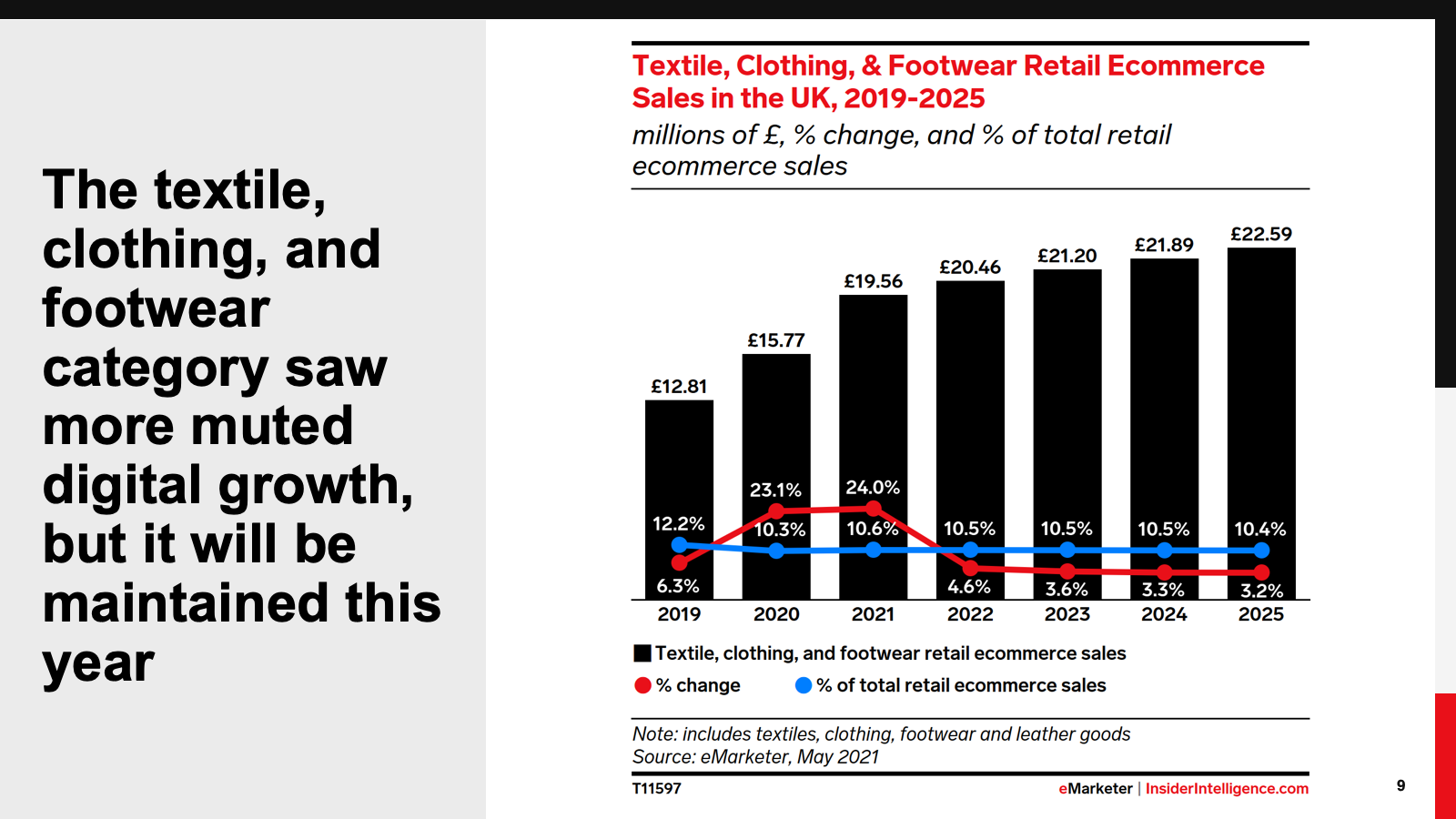 Online, the food and beverage and household goods categories benefited from UK lockdowns. Older age groups adapted to online grocery shopping, boosting the food and beverage category. Household goods, meanwhile, benefited from people stuck at home seeking to improve their lockdown experience. The textiles, clothing, and footwear category suffered badly, even though ecommerce sales remained strong. By 2025, we expect ecommerce sales to account for half of all sales in this category.