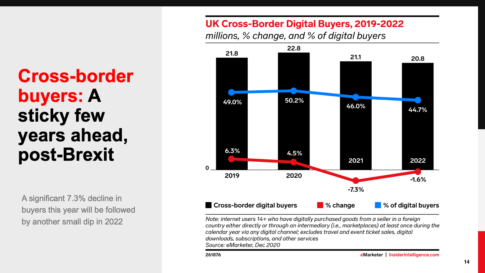 The UK already has a high number of digital buyers, but social media buying is not yet commonplace. That will begin to change, though, as more people buy via social channels. Cross-border buyer numbers will dip, as Brexit concerns take their toll. The number of click-and-collect buyers, meanwhile, will remain strong, underpinned by a mature grocery sector.