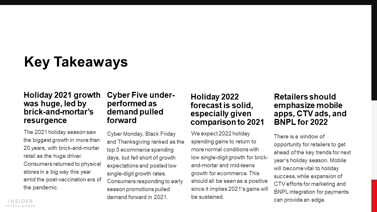 WHAT’S IN THIS REPORT? A review of the 2021 US holiday season and an early preview of the 2022 holidays, including our latest US retail and ecommerce spending forecast.