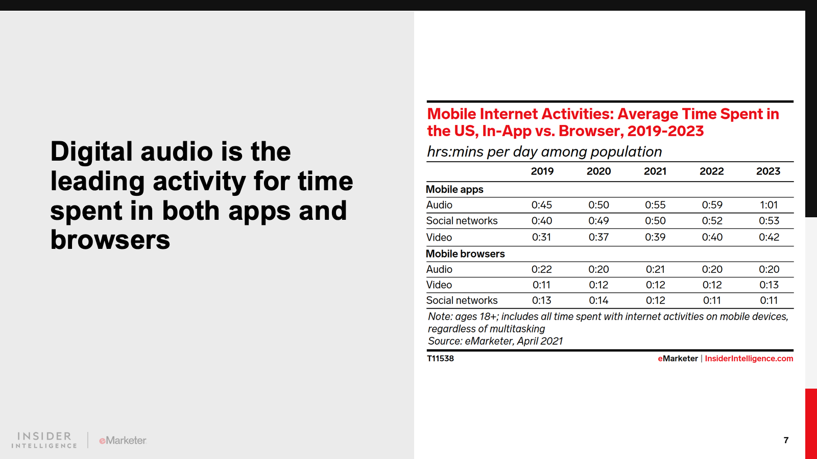 For the most part, the pandemic accelerated existing trends. The big exceptions were in travel-related apps, which saw a large decrease in time spent during the pandemic, and digital audio apps, which grew but without a noticeable spike in 2020. These apps will return to faster growth in 2021.