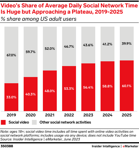 KEY STAT: Video’s share of average daily time with social networks has risen dramatically since 2019, but future gains will be much smaller.