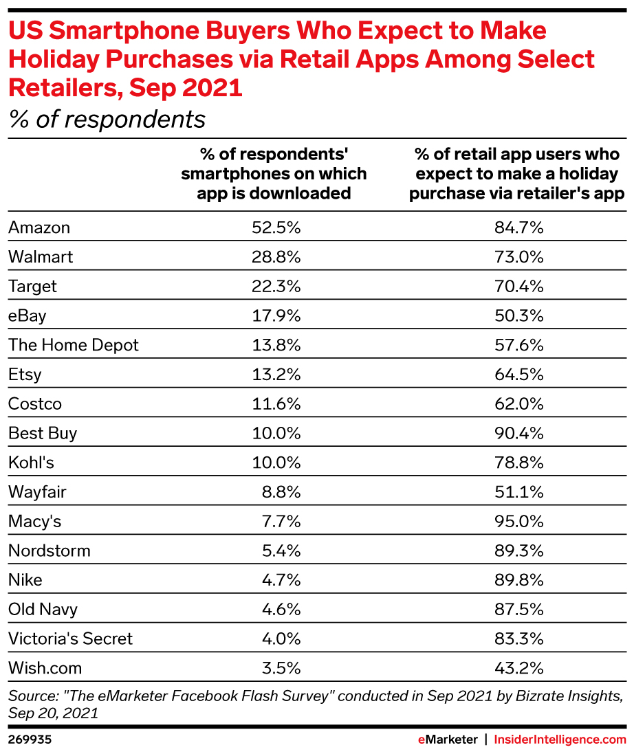 • Amazon had the top penetration among retail mobile apps at 52.5%, with 84.7% of those users expecting to purchase on the app during the holidays.